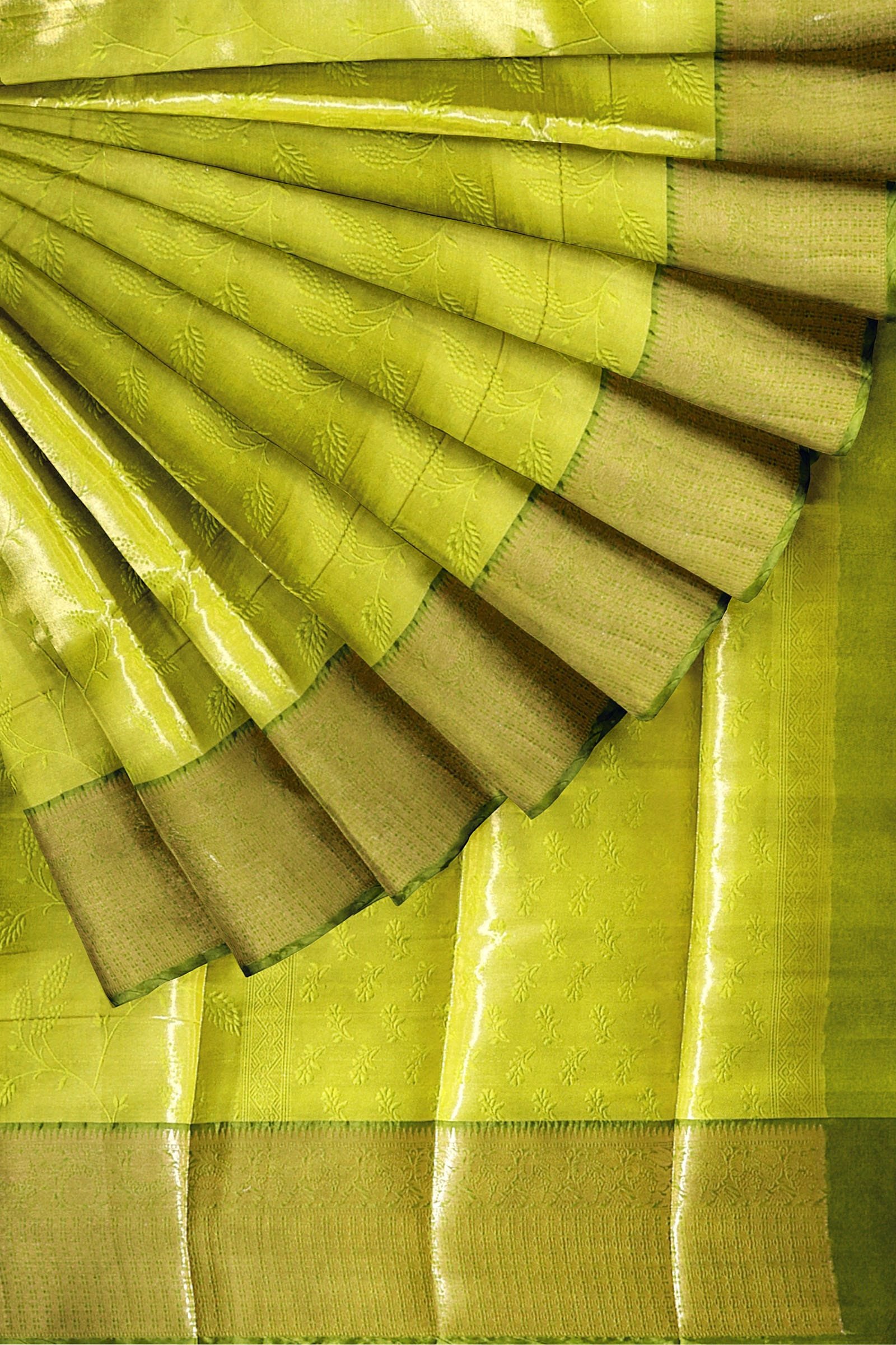 Avoid soaking the saree. Gently wash it in cool water with a small amount of liquid detergent. Squeeze out excess water and rinse under running water until it runs clear, but do not wring it.