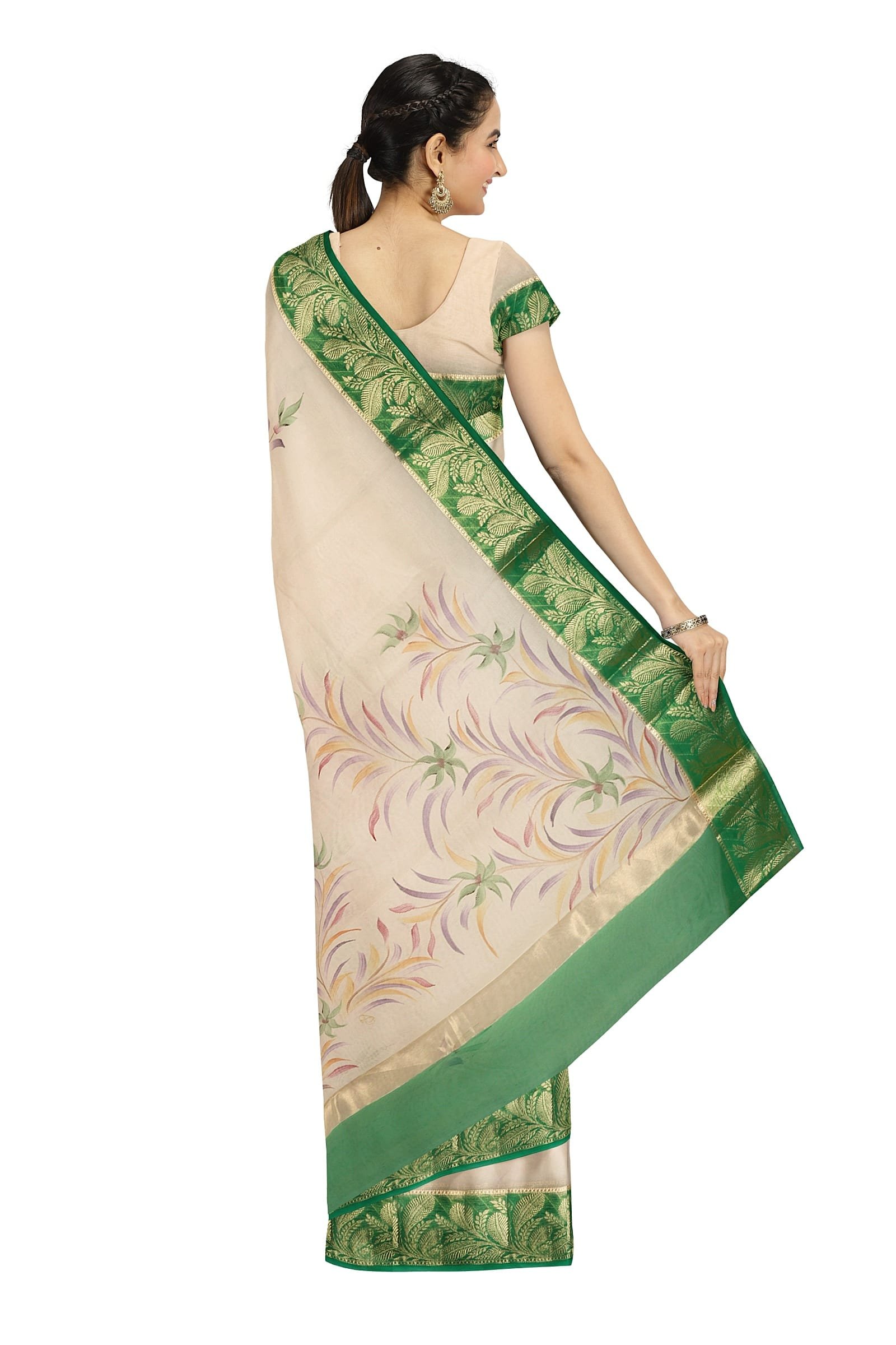 A Banarasi organza saree embodies inspiration through its exquisite use of gold and silver metallic threads (zari), crafting shimmering motifs that dance across the drape. This intricate artistry adorns the border and pallu, reflecting the timeless elegance of Mughal-era influences and the vibrant tales of Indian folklore.
