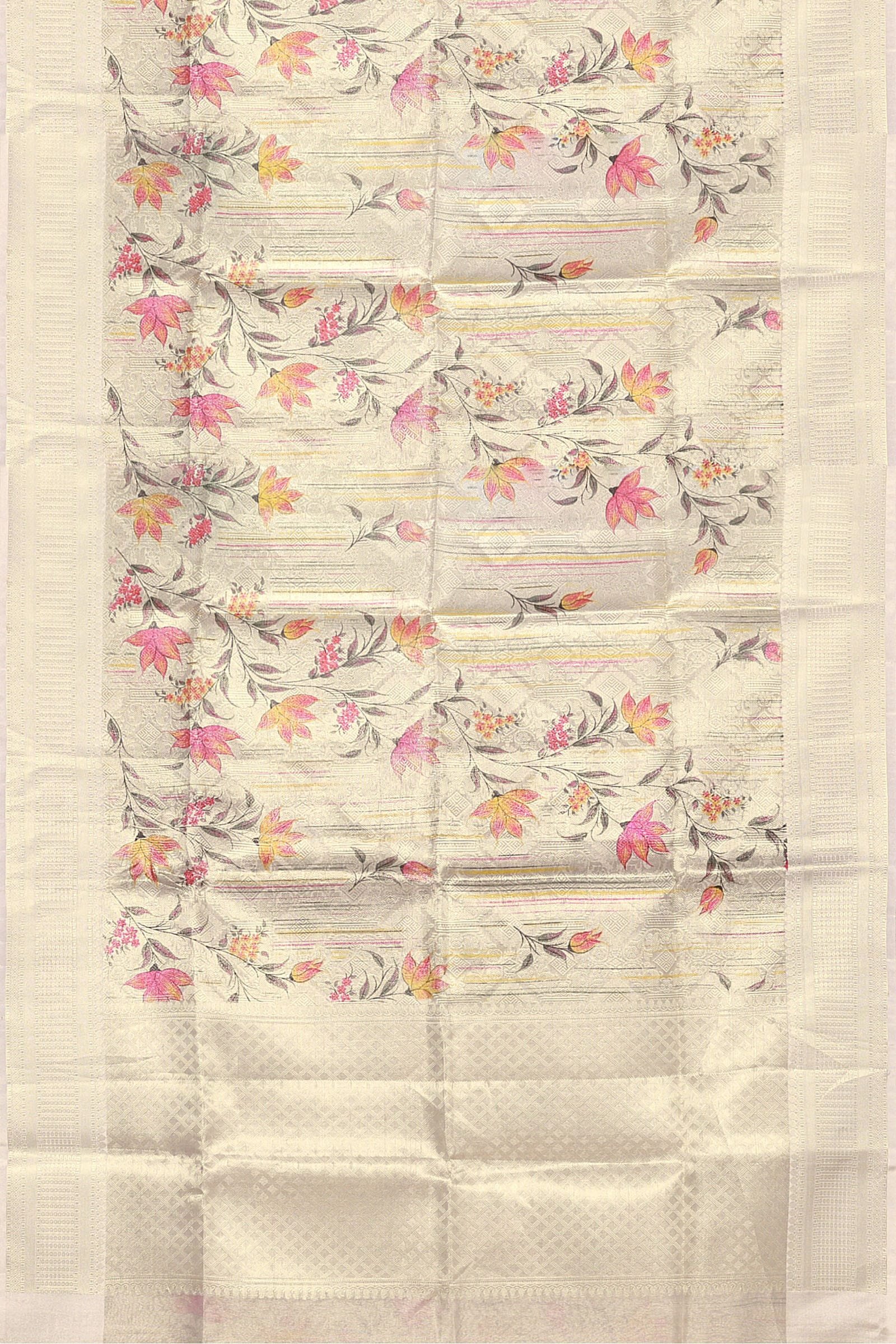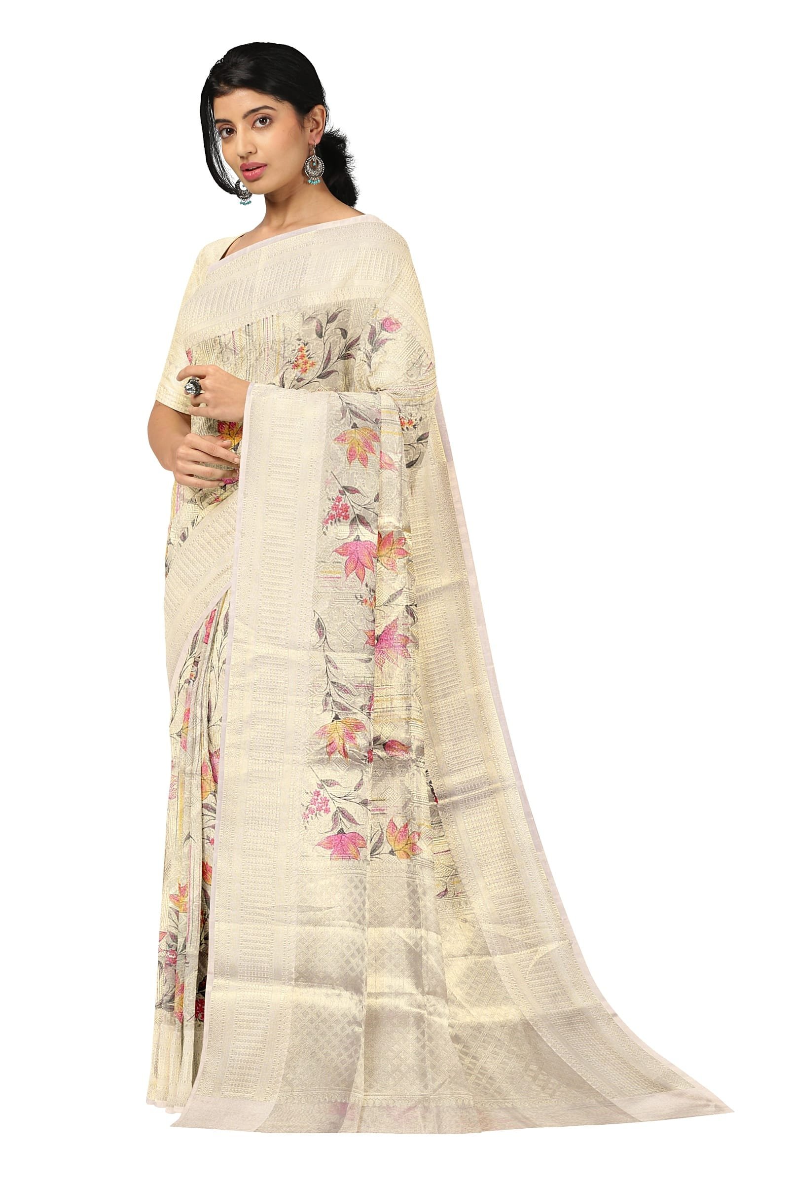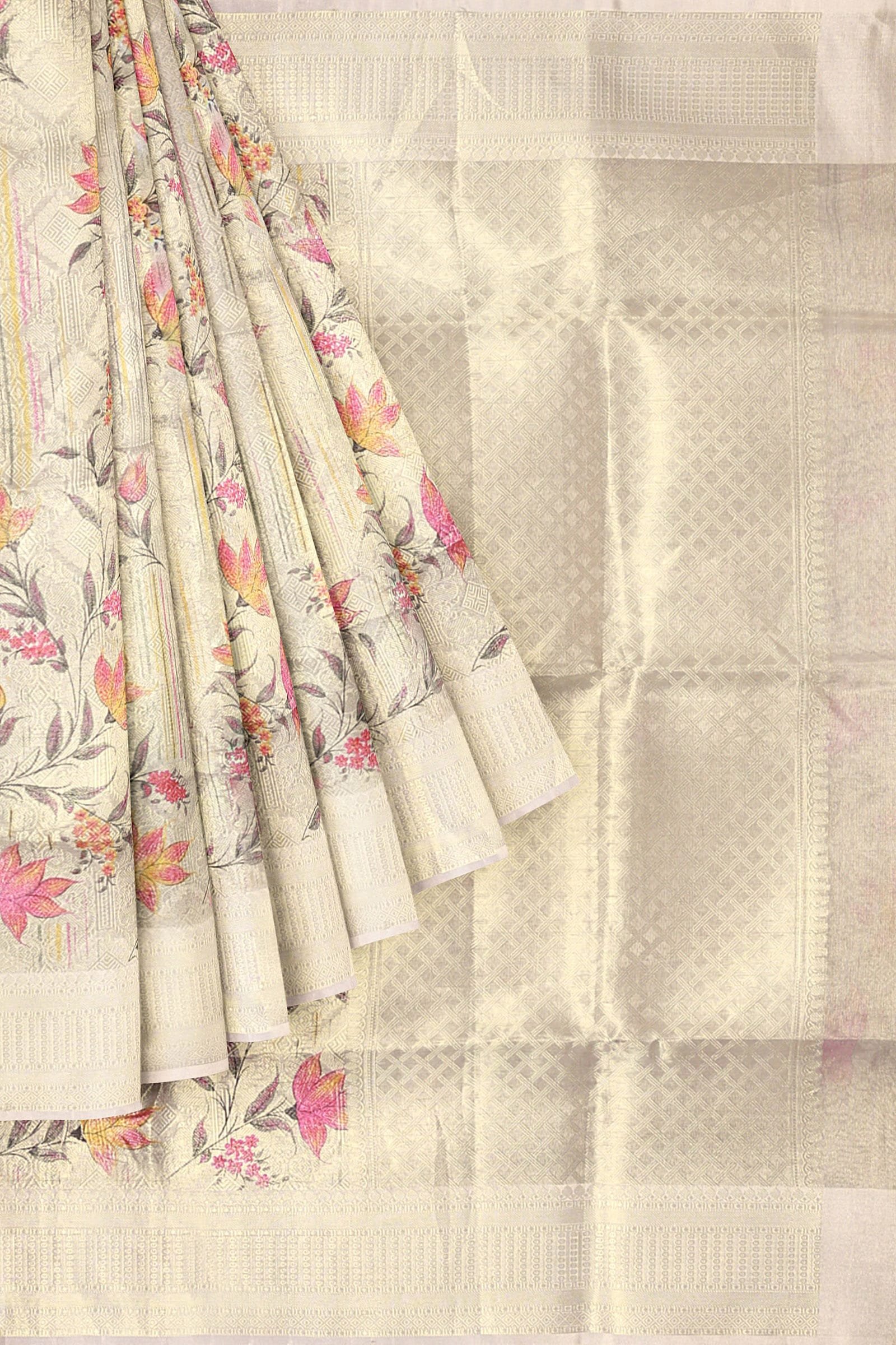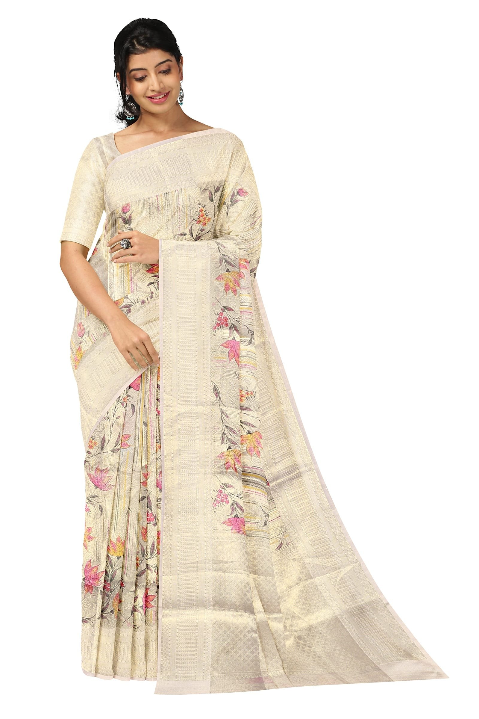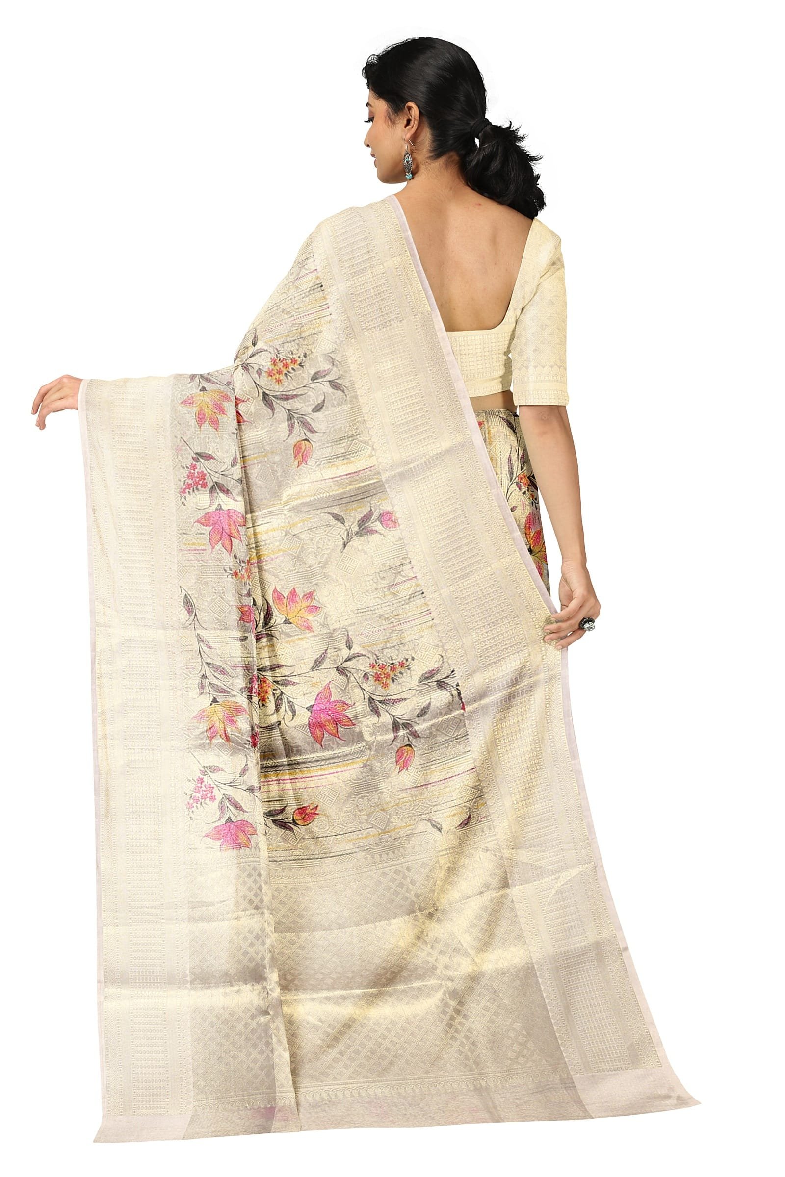 Beige Silver Banarasi Organza Saree adorned with exquisite floral embroidery.