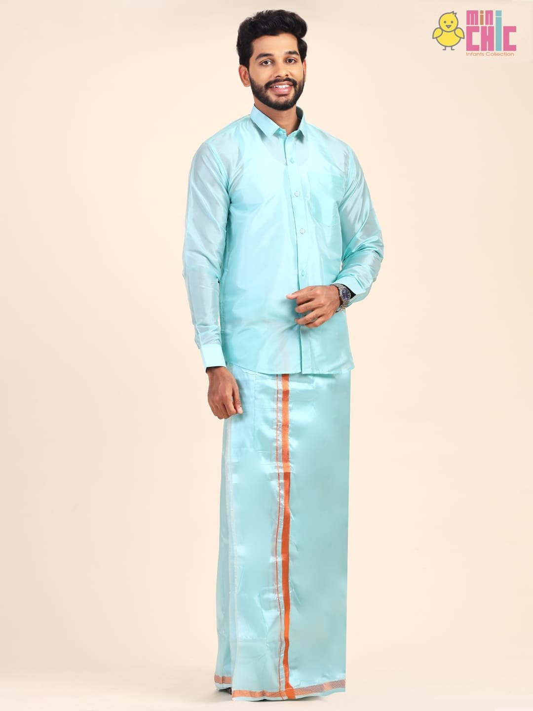 This set comes with shirt and dhothi set,it’s a traditional garment can be wear during traditional functions. The shirt and dhothi both made up of same shiny material which make this combo a unique one. The dhothi had contrast border which gives premium look and has velgro at waist for easy and comfort to wear. It was the best costume to match with  your kids during our own traditional functions to sustain our cultural heritage