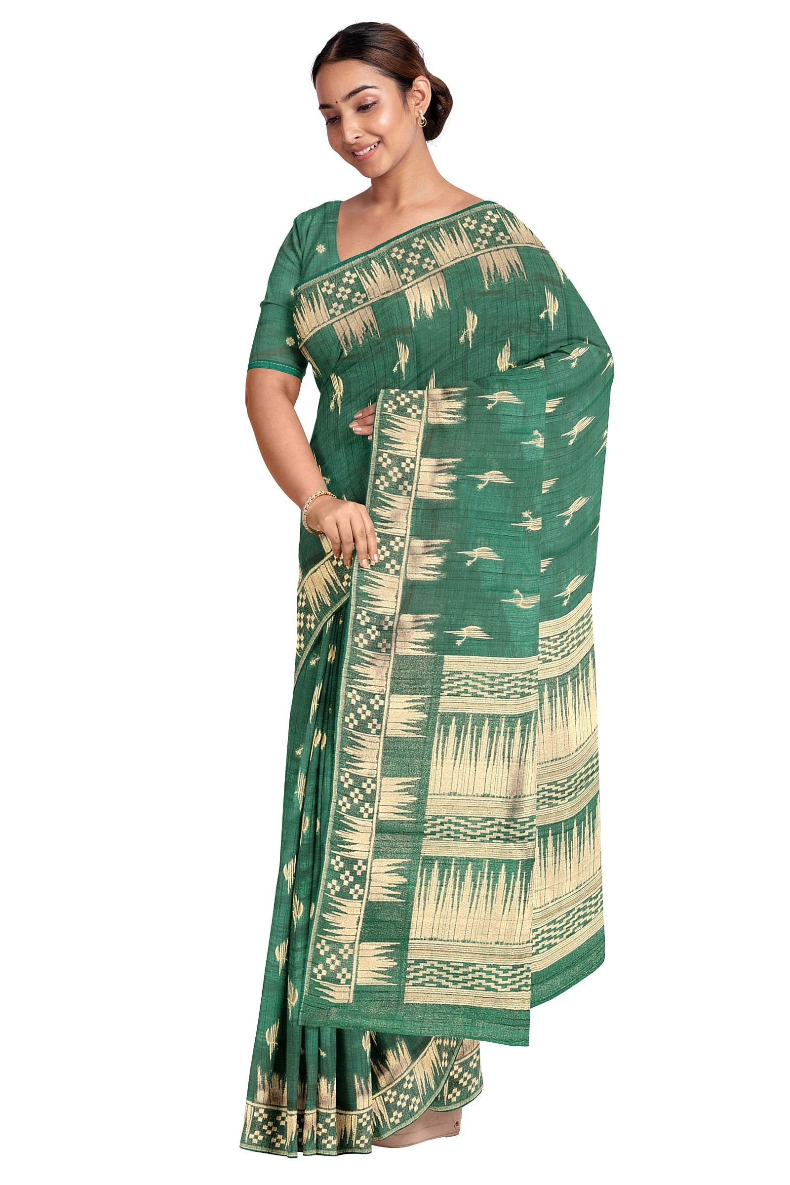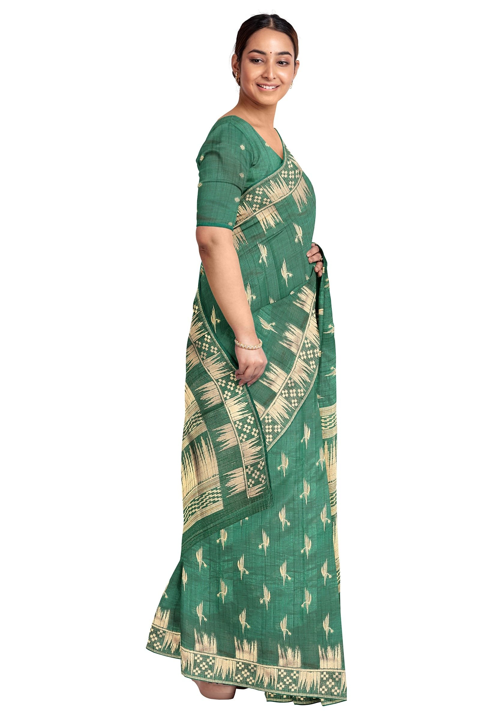 Experience the beauty of our Pochampally Jute Cotton Sarees. These sarees are perfect for festive occasions, enhancing your work attire, and adding elegance to your everyday look. They feature traditional geometric patterns that repeat beautifully across the saree. Nature-inspired designs, including birds and flowers, provide an extra touch of inspiration.
