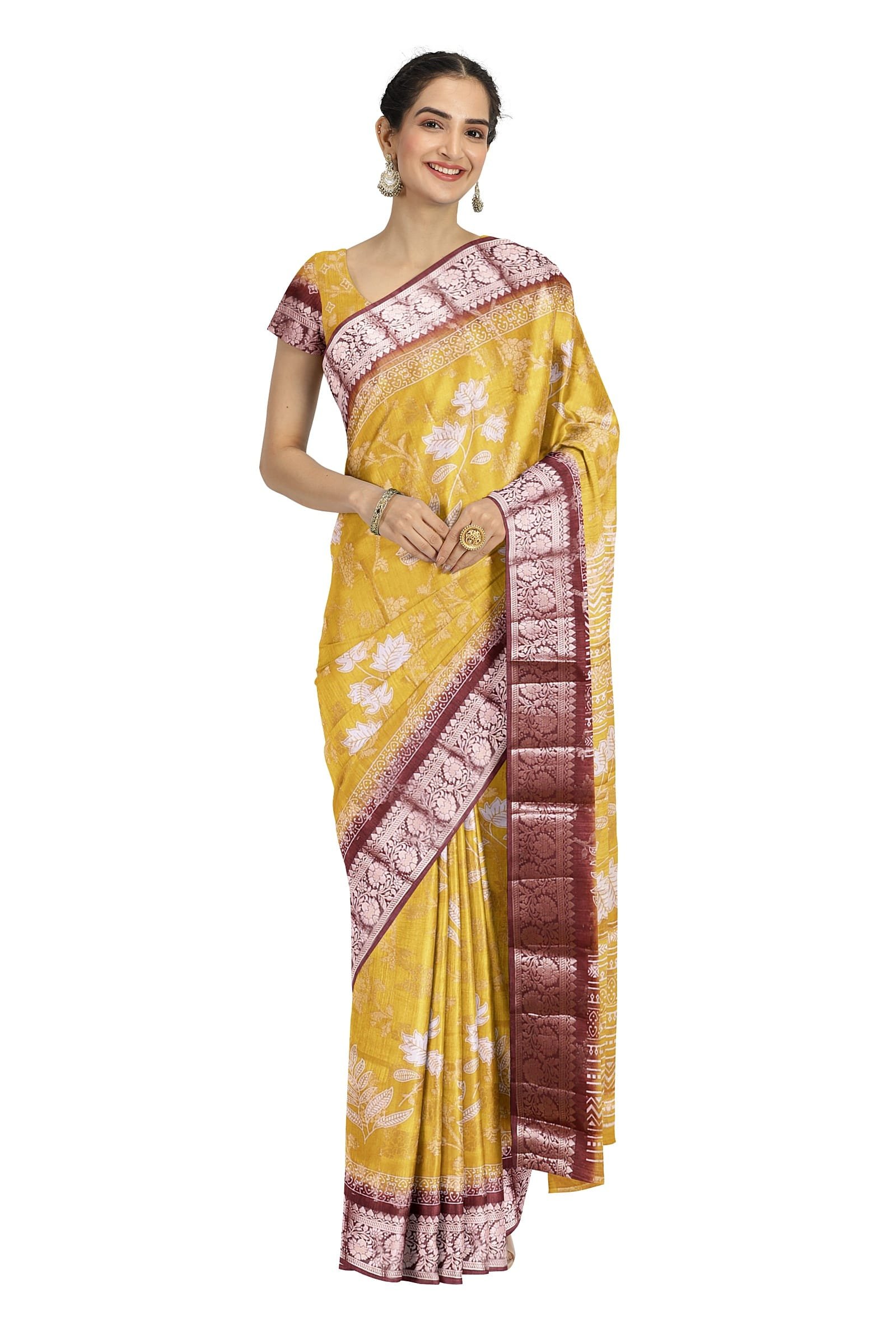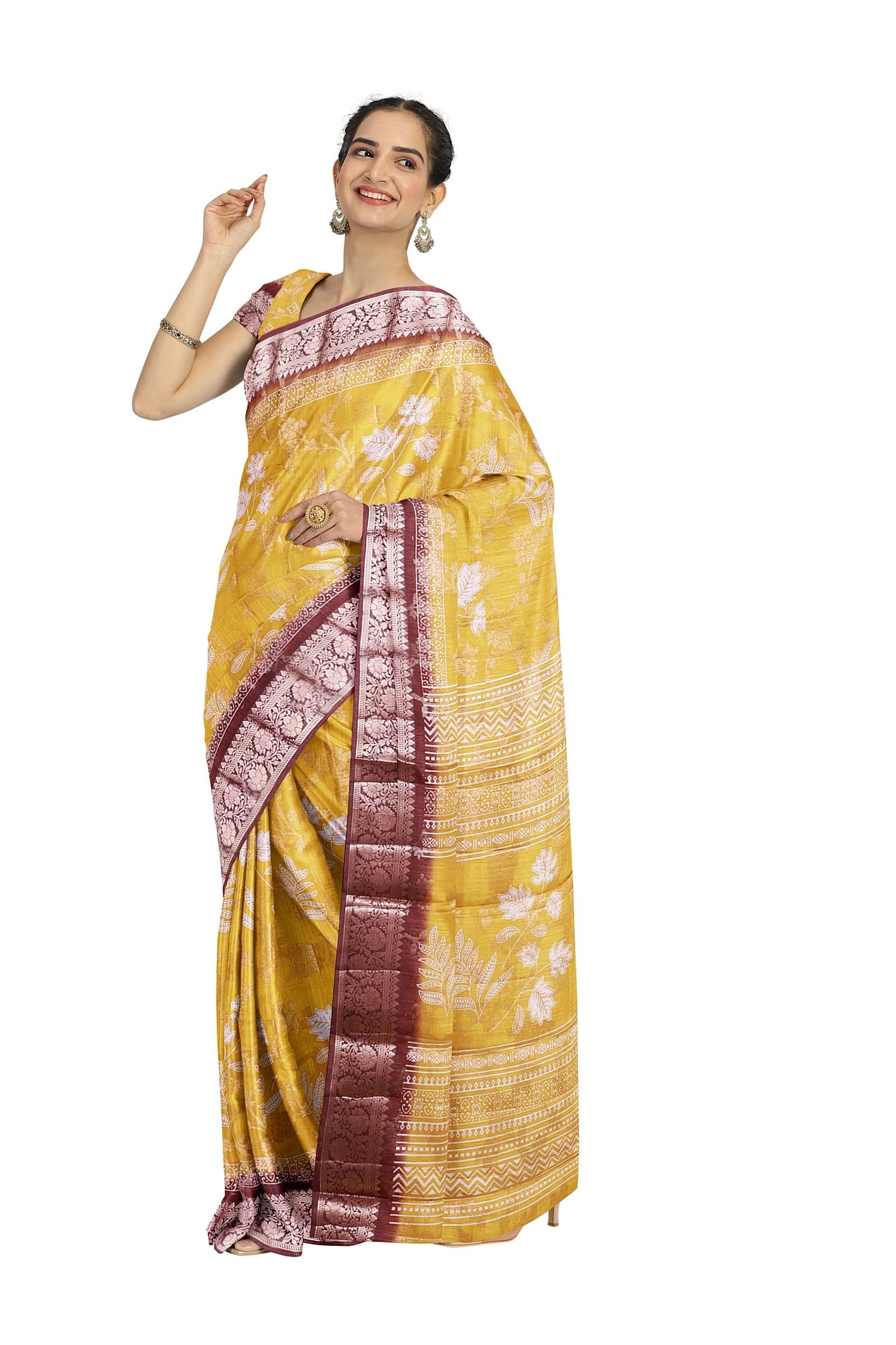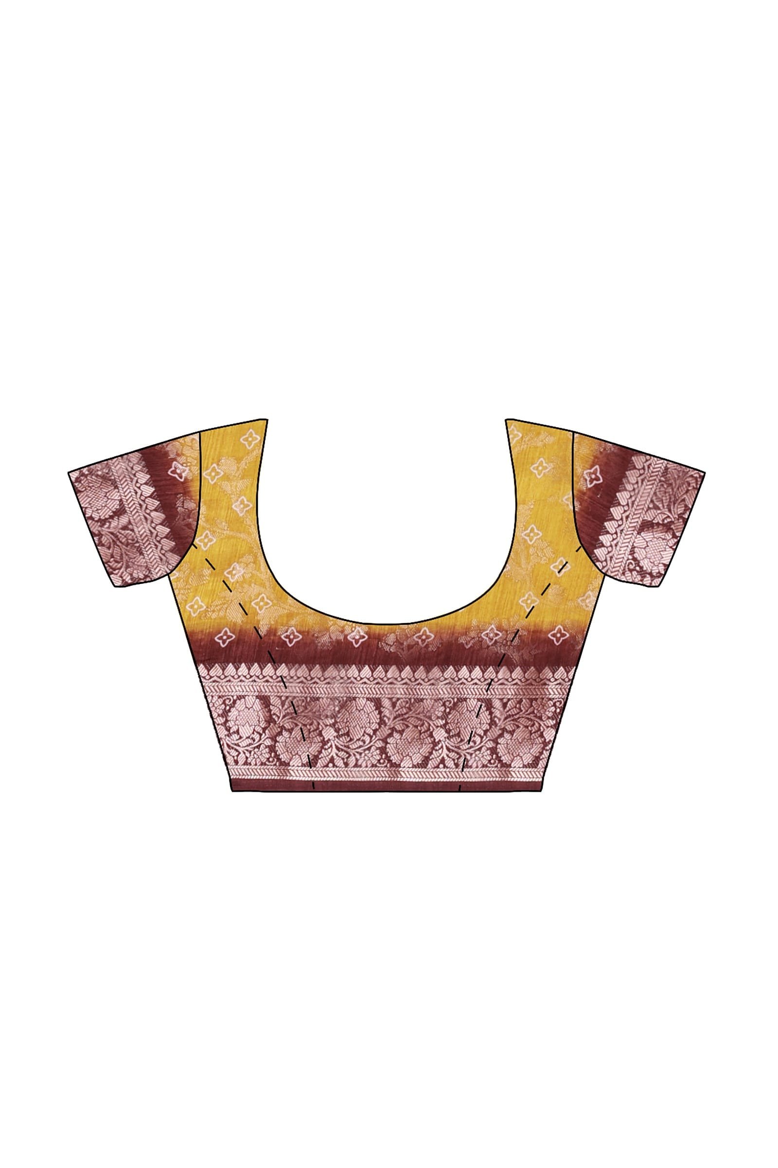 The saree comes with an unstitched blouse piece integrated into one end, which requires the user to detach it. Specifications: Total Length: 6.30 meters (consisting of 5.5 meters for the saree and 0.8 meters for the blouse piece). Width: Approximately 1.2 meters. For a closer look at the blouse piece, please check the last image, which offers a detailed view.
